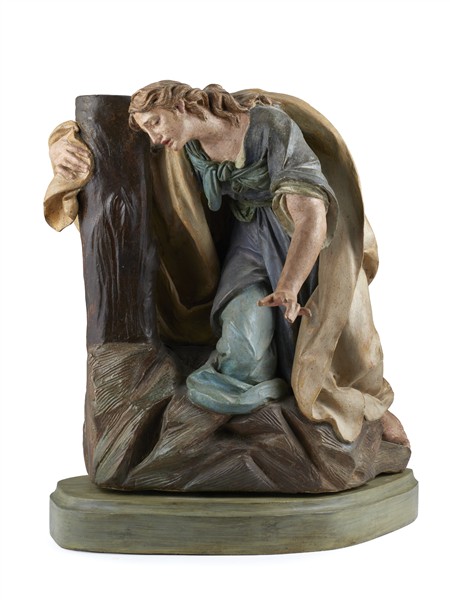 "Mary Magdalene" model of a kneeling sculpture in raw clay and polychrome terracotta (cm 30x27x28) (defects and restorations)