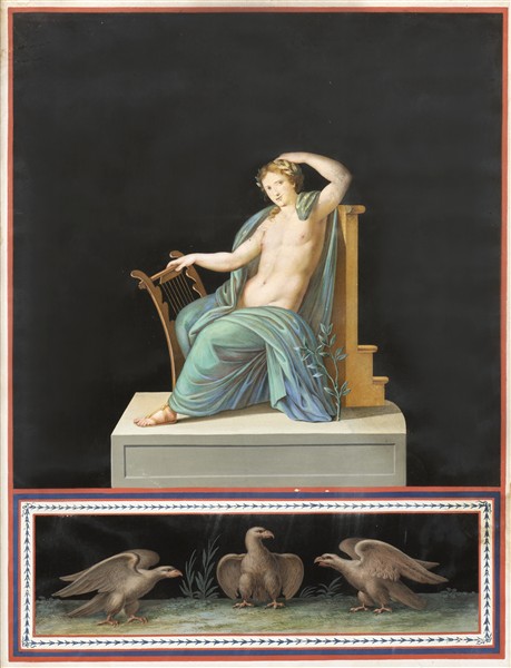 La produzione del Maestri si rifà quasi esclusivamente agli scavi di Ercolano e Pompei, ma si dedica anche ad eleganti riproduzioni dagli affreschi di Raffaello e Giulio Romano. La sua caratteristica principale è quella di giungere ad una astrazione, ad una metafisica dell'immaginario classico e rinascimentale, in modo particolare quando dipinge, come in questo caso, su superficie smaltate di nero, dove le figure spiccano con raffinata eleganza e leggerezza.