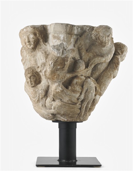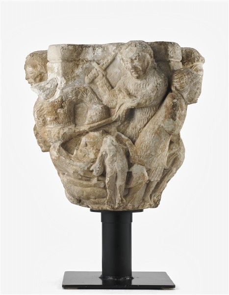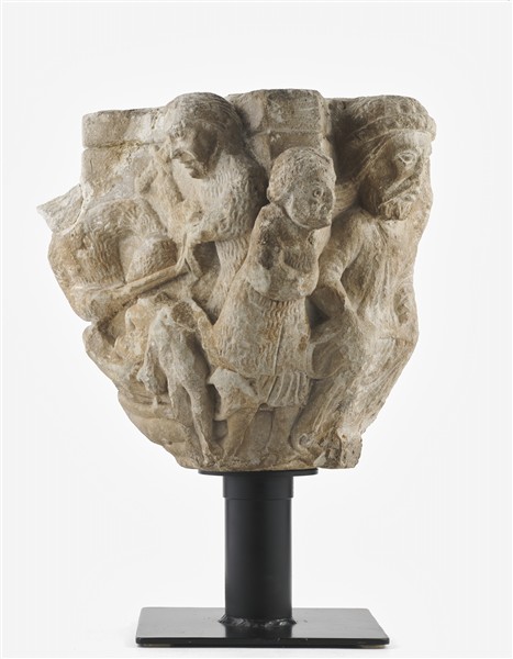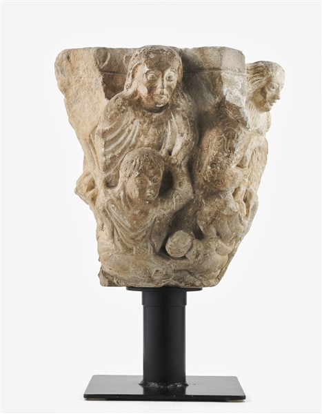 Arte del secolo XII-XIII. Capitello in marmo scolpito a figure religiose e guer
