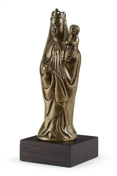 Arte fiamminga, secolo XV. "Madonna col Bambino", scultura in ottone a tutto tondo. La Madonna raffigurata eretta col Bambino nella mano sinistra mentre con la destra trattiene la propria veste (cm 21x6,5x6,5) poggiante su base lignea quadrata di epoca posteriore (difetti)