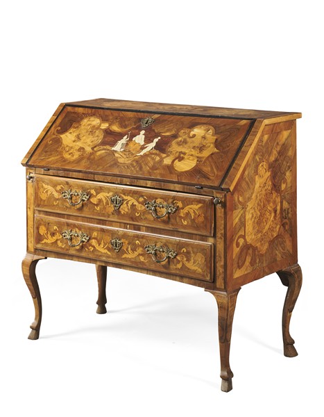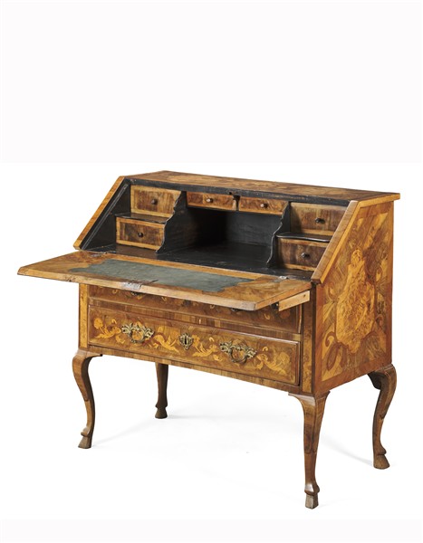 Ribalta lastronata in noce e radica, fronte a due cassetti decorati a motivi floreali e calatoia centrata da intarsi in avorio che rivela vano a giorno e sei tiretti, gambe mosse. Torino, secolo XVIII (cm 111x105x55) (difetti e restauri)