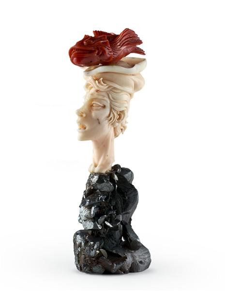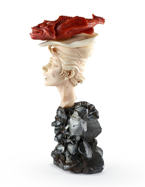 Carlo Parlati (1934-2003) "Fisherman", 1975 ca. All-round white coral head with cap surmounted by fish in red coral, signed on the back. Standing on stone base (cm 9,5x15,5) (minor defects)