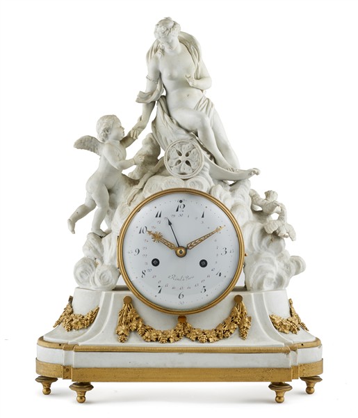 A biscuit and gilded bronze clock surmounted by Venus and Cupid. White enamel dial with arabic numerals, monthly calendar, two-train movement with hour and quarter ring on bell. France, second half of the 18th century (h. cm 48) (defects)