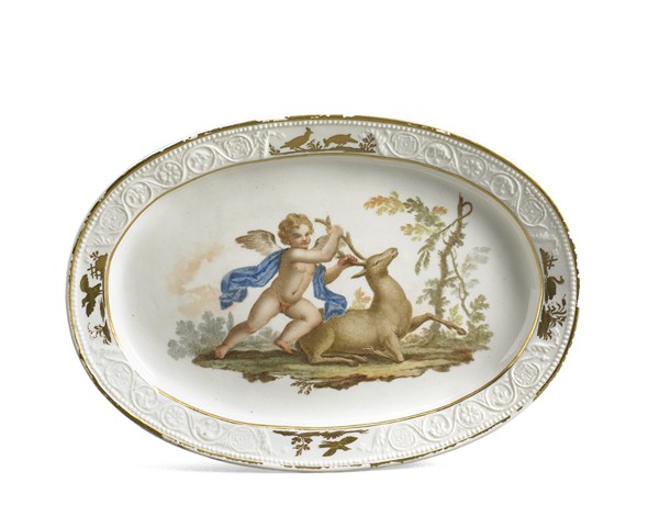 Manifattura della Real Fabbrica Ferdinandea, Napoli, 1780 circa. Piattino ovale dal "Servizio Ercolanese" decorato da Giacomo Milani e Antonio Cioffi. In porcellana dipinta in policromia e dorato, cavetto decorato da scena con fanciullo alato che lotta con un cervo, la falda a rilievo con decori stilizzati tra volute e profilo perlinato. Iscritto "MUS. ERCOL. SERIE DI PITTURE, FANCIULLO CHE LOTTA CON UN CERVO" e marcato al retro FRF coronato in rosso (cm 20x14) (difetti)