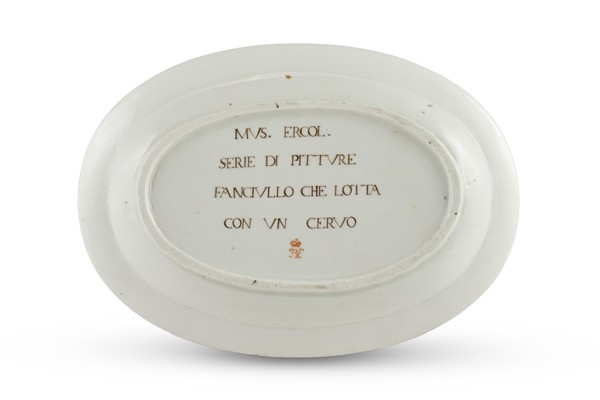 Manufacture of the Royal Fabbrica Ferdinandea, Naples, circa 1780. Oval polychrome porcelain saucer from the "Ercolanese Service" decorated by Giacomo Milani and Antonio Cioffi. Enrolled "MUS. ERCOL. SERIE DI PITTURE, FANCIULLO CHE LOTTA CON UN CERVO" and marked on the back FRF crowned in red (20x14 cm) (defects)