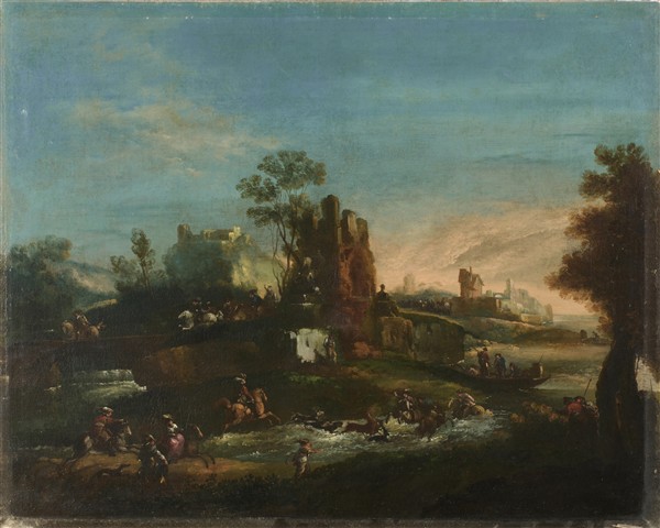 Maestro veneto del secolo XVIII "La caccia al cervo con paesaggio sullo sfondo