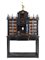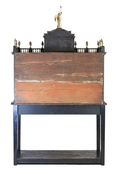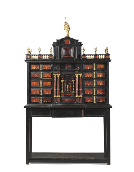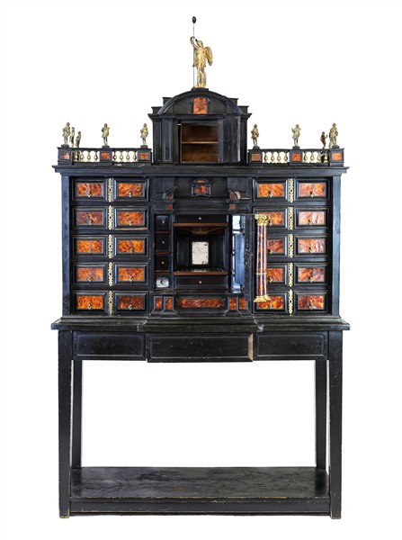 Monetiere in legno ebanizzato con inserti in tartaruga, fronte a struttura architettonica con numerosi cassetti e anta centrale con doppia colonna e timpano a linea spezzata centrata da nicchia centinata tra colonne tortili con figura allegorica. Parte superiore con balaustra sormontata da figurette in metallo dorato e centrata da piccola anta cimata da figura di Vittoria alata, sostegno a tavolo con gambe squadrate e piano di raccordo. Secolo XIX (cm 123x210x47) (difetti, restauri e mancanze)