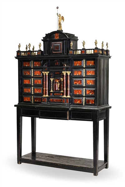 A 19th century ebony coin cabinet with turtle inserts, architectural front with numerous drawers and central door with allegorical figure between two columns. Upper part with balustrade surmounted by golden metal figures and centered by winged Victory (cm 123x210x47) (defects, restorations and losses)