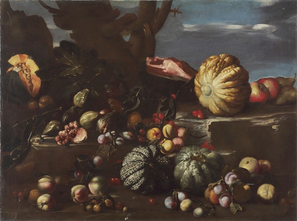 "Composition with melons, figs and other fruits in a landscape"