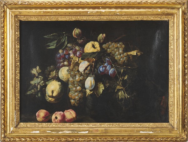 Maestro romano del secolo XVII "Composizione con cesta di frutta" olio su tela