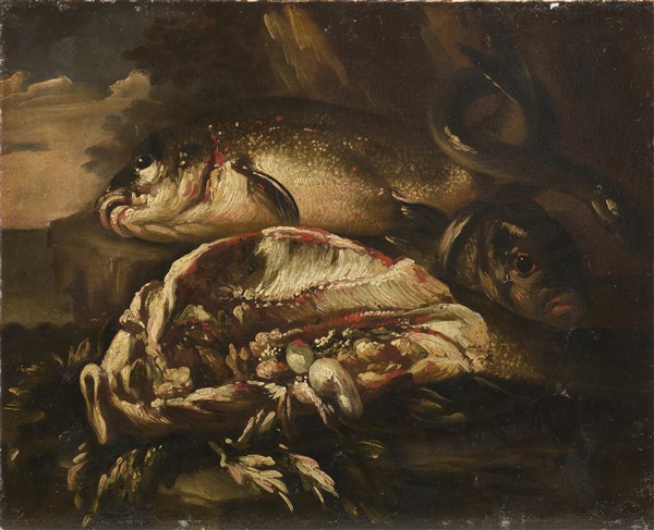 Felice Boselli "Composizioni con pesci in un paesaggio" coppia di dipinti ad oli