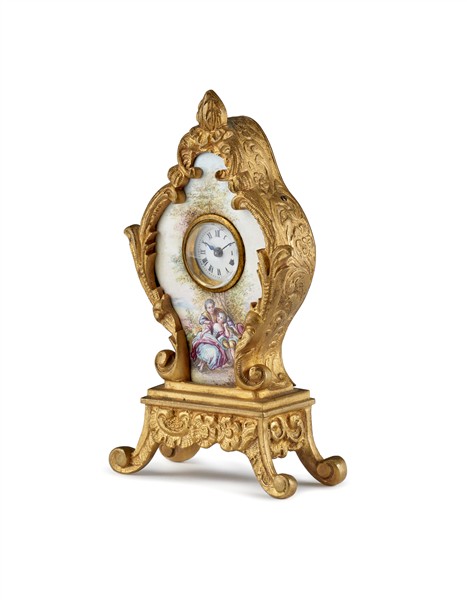 Pendoletta da scrivania in bronzo dorato e placca in smalto policromo a soggetto galante, quadrante a numeri romani con movimento solo tempo (h. cm 9) (difetti)