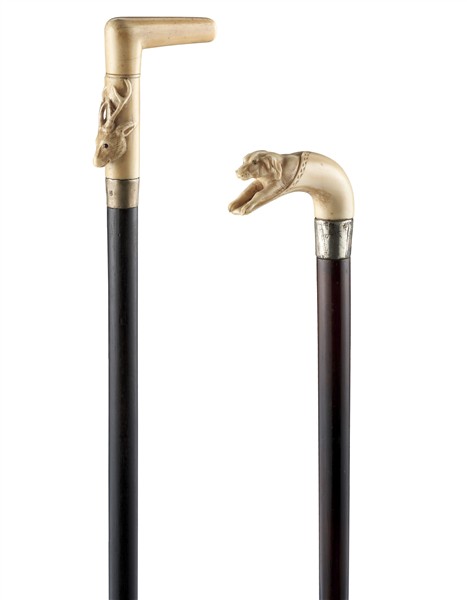 Arte del secolo XIX. Lotto composto da due bastoni da passeggio con presa sagomata a "L" in avorio scolpito raffiguranti rispettivamente un cane ed un cervo con occhi in vetro rosso, ghiere in metallo argentato (L. max cm 86) (difetti e mancanze)