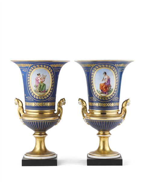 Manifattura francese, secolo XIX. Coppia di vasi a cratere in porcellana dipint