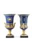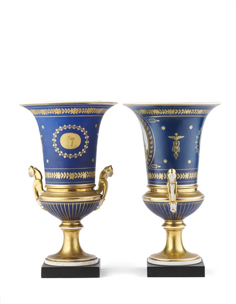 Manifattura francese, secolo XIX. Coppia di vasi a cratere in porcellana dipinta in policromia su fondo blu con bordure in oro, anse a busto di erma con volto in biscuit, fronte con figura allegoriche entro cartiglio ovale, basi in marmo nero (h. cm 34) (difetti, uno con restauri)