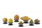 Group of seven different fruits in wax and other polychrome materials with ebonised wooden bases bearing descriptive labels. 1940 circa (h. max cm 13,5) (defects)