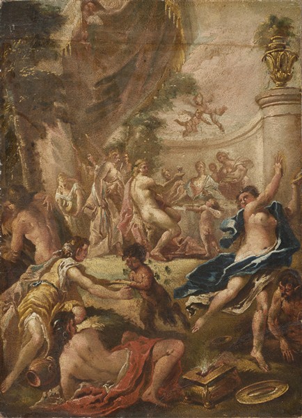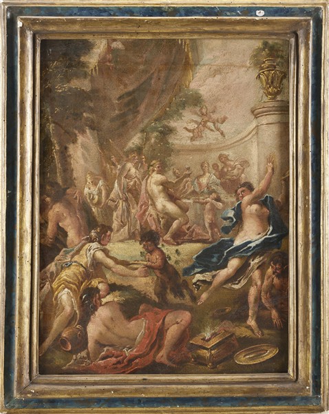 Scuola veneta del secolo XVIII "Scena di banchetto" olio su carta applicata su