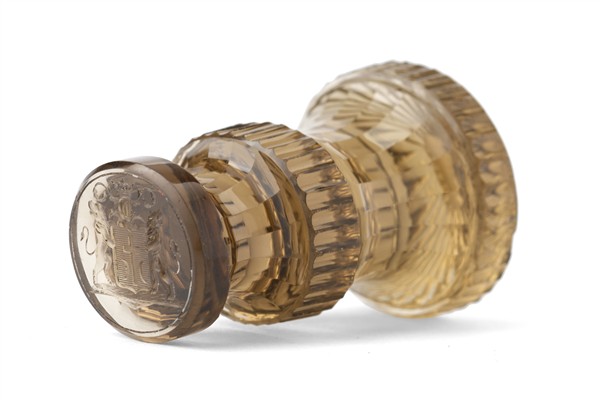 Sigillo in quarzo fumè sfaccettato con stemma araldico inciso alla base. Franci