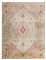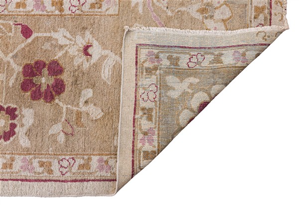 Tappeto Amritzar, India, fine secolo XIX. Decoro con grande medaglione polilobato con puntali composto da tre medaglioni concentrici nei toni del beige, rosa e camoscio. Fondo color bianco cosparso di rami fioriti stilizzati nei medesimi toni del medaglione. Quattro angolari a fondo rosa. Grande bordura Herati su fondo camoscio (cm 600x456) (difetti e vecchi restauri)