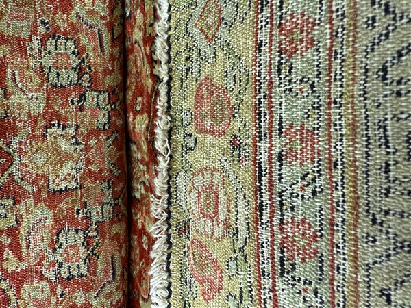 Tappeto Senneh, Persia, seconda metà del secolo XIX. Decoro Herati su fondo rosso. Interessanti bordure, quella interna a fondo bianco decorata con cartigli contenenti scritte in persiano antico con delineo nero. L'esterna a meandro con rose Qajar su fondo giallo (cm 229x146) (difetti e rapature)