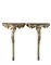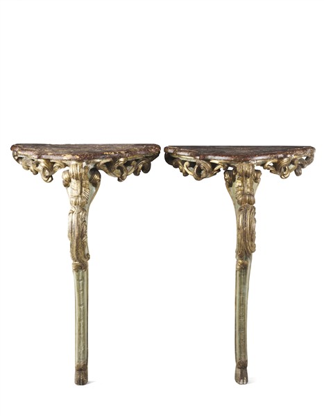 Coppia di piccole console con piani sagomati in legno laccato e dipinto a finto marmo con gamba centrale intagliata e dorata a volute fogliate terminante a piedi caprini. Probabilmente Ferrara, secolo XVIII (cm 63x92x34) (difetti e mancanze)