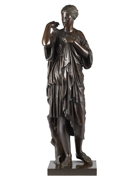 Fonditore del secolo XIX. "Diana" scultura in bronzo dal modello della Diana di Gabi, conservata presso il Museo del Louvre tradizionalmente attribuita a Prassitele e raffigurante una donna, probabilmente Artemide, avvolta in un drappeggio su piedistallo quadrato fuso integralmente (h. cm 65) (lievi difetti)