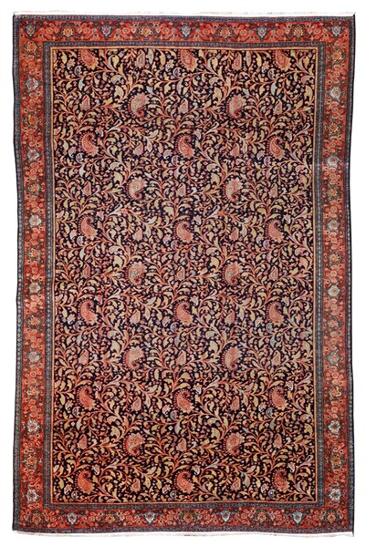 Tappeto Senneh, Persia, seconda metà del secolo XIX. Decoro di ispirazione millefleur con file di Boteh nei toni del rosso, rosa, azzurro legati da racemi fogliati con altri piccoli Boteh stilizzati su fondo blu notte. Bordura Herati su fondo rosso (cm 198x131) (difetti)