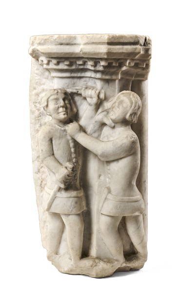 Sculptor of the 16th century. Architectural marble fragmente depicting fightings figures (cm 23x47x21,5) (defects and losses)