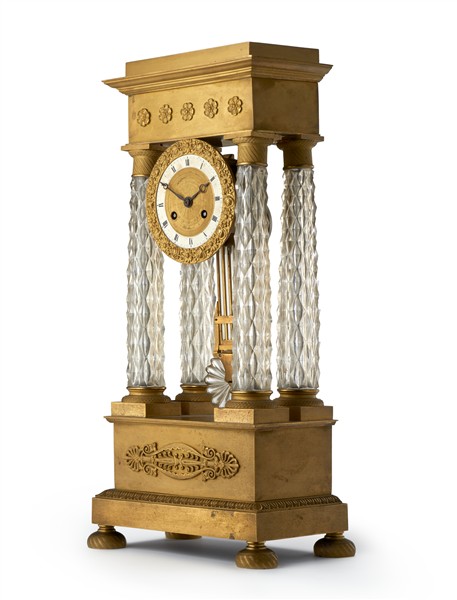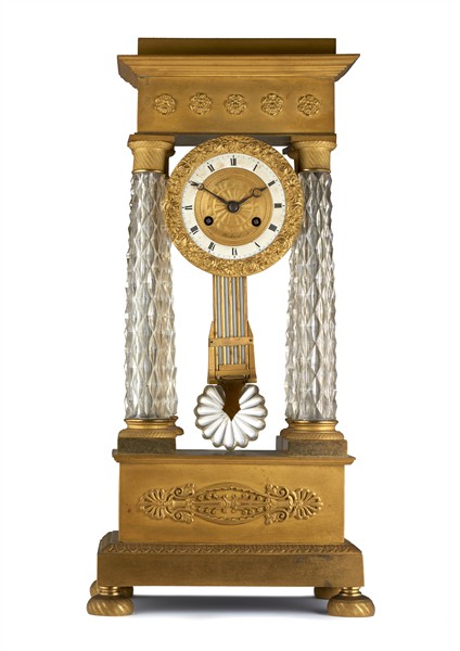 Pendola a portico in bronzo dorato e cristallo molato. Quadrante a fascia in smalto bianco a numeri romani, movimento a due treni con suoneria delle ore e mezze su campanello. Francia, secondo quarto del secolo XIX (cm 21x46) (difetti)