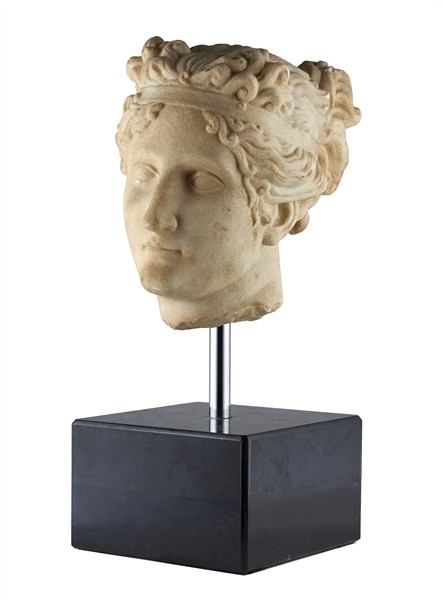 Testa di Venere dall'antico in marmo scolpito (h. cm 26) su base in marmo nero di epoca successiva (h. tot cm 38) (difetti)