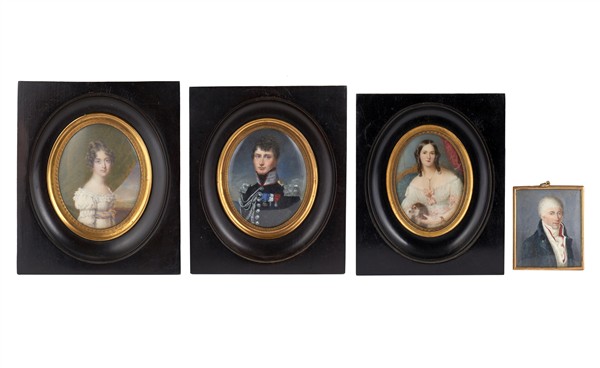 Arte del secolo XIX. Lotto composto da quattro miniature su avorio di cui due ovali raffiguranti gentildonne, una ovale con ritratto di ufficiale con occhi azzurri datato 1816 ed una raffigurante gentiluomo dai capelli bianchi (h. max cm 10) In cornici (difetti)