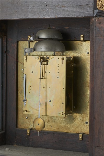 Pendola romana in legno con fregi in bronzo dorato, quadrante a fascia argentata a numeri romani, movimento a due treni con suoneria delle ore e dei quarti su campanelli, scappamento a verga. Italia, secolo XVIII (h. cm 53) (difetti, mancanze e movimento della sveglia asportato)
