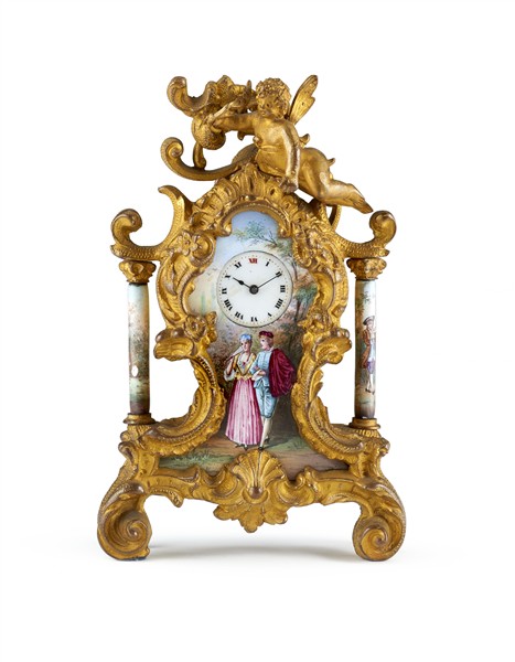 Pendoletta da scrivania in bronzo dorato e smalti policromi a soggetto galante. Quadrante in smalto bianco a numeri romani, movimento solo tempo. Seconda metà del secolo XIX (h. cm 13) (difetti e mancanze)
