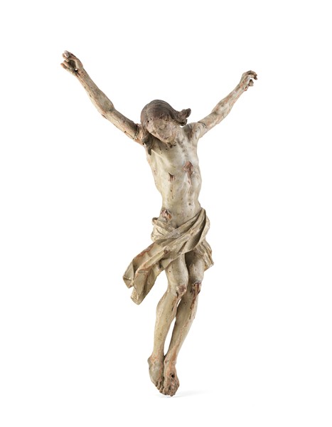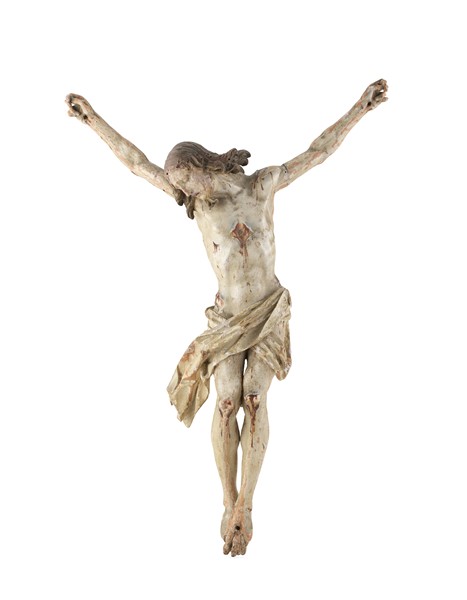 Arte del secolo XVIII. Cristo crocifisso, scultura in legno intagliato, dipinto e laccato in policromia (cm 30,5x43,5) (difetti, rotture e restauri)