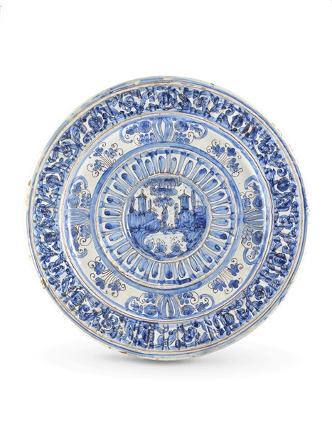 Manifattura di Pavia, inizio secolo XVIII. Grande bacile da acquereccia in maiolica dipinta in monocromia nei toni del blu con doppia bordura baccellata e decori a volute fogliacee e a paesaggio con architetture nell'umbone (d. cm 39) (difetti)