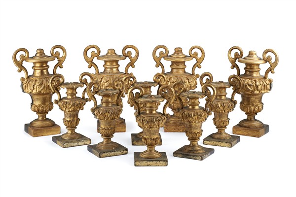 Arte del secolo XIX. Dieci portapalme in legno intagliato e frontalmente dorato in forma di vaso biansato con decoro a volute fogliate su base quadrata, di diverse misure (h. max cm 28) (difetti e restauri)