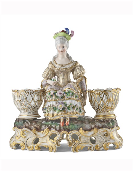 Manifattura di Jacob Petit, Francia, secolo XIX. Calamaio in porcellana dipinta in policromia centrato da gentildonna con cappello piumato e abito con fiori a rilievo, due vaschette traforate e profilate in oro con base a motivi rocaille. Marcato JP sotto la base (h. cm 33x28) (difetti)