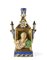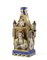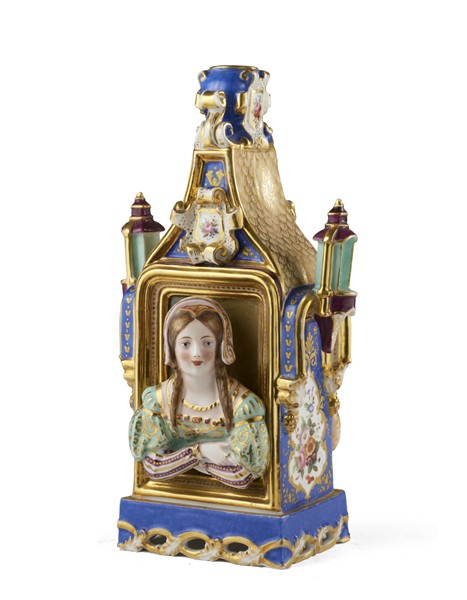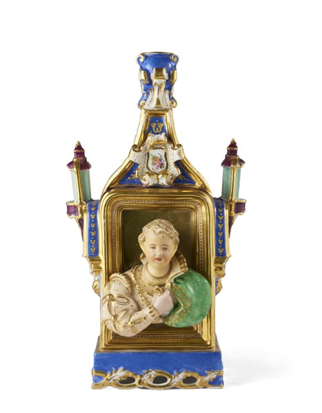 Manifattura di Jacob Petit, Francia, secolo XIX. Flacone porta profumo in porcellana policroma e profili dorati con figure in costumi d'epoca che sporgono da due finestre sormontate da cartiglio centrato da fiori, fianchi a fondo blu con mazzi di rose entro riserve e lanterne a rilievo, base traforata (h. cm 27) (difetti e restauri)