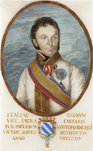 Iscritto "ITALIAE REGNUM / VICE. SACRA CAESARIS / SUB. IMPERIUM ACCEPIT. PATRIAE . VOTI.s / VICTOR SOSPES. RESTITUTUS / ANNO / MDCCCXIV"