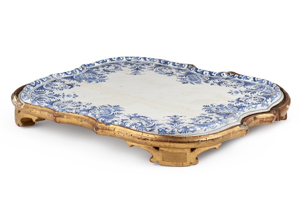 Antonio Maria Coppellotti (attr), Lodi, secolo XVIII. Vassoio polilobato in maiolica decorata nei toni del blu a volute fogliate e fiori, montato nel secolo XIX ad alzata su base in legno dorato di forma sagomata (cm 50x6x44) (difetti e restauri)