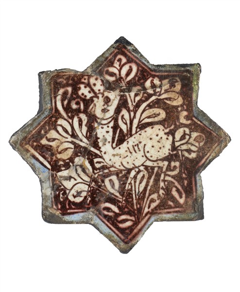 Manifattura persiana, probabilmente secolo XIV. Piastrella a stella con otto punte dipinta in policromia con cerbiatto tra fiori (cm 13x13) (difetti, ricomposta in più parti)