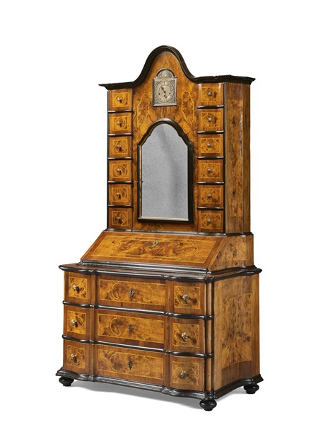 Trumeau lastronato e filettato in legni vari e radica con profili ebanizzati. Parte superiore sormontata da orologio con anta centrale a specchio sopra due cassetti tra due file di sei tiretti. Parte inferiore con fronte sagomato a tre cassetti. Austria, secolo XVIII (cm 138x87x64) (difetti e restauri)