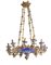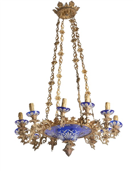 Boemian manufacture, 19th century. A gilded metal twelve-light chandelier with blue glass drippers and finials, arms in the shape of leafy branches, chain supports (h. cm 100) (defects)