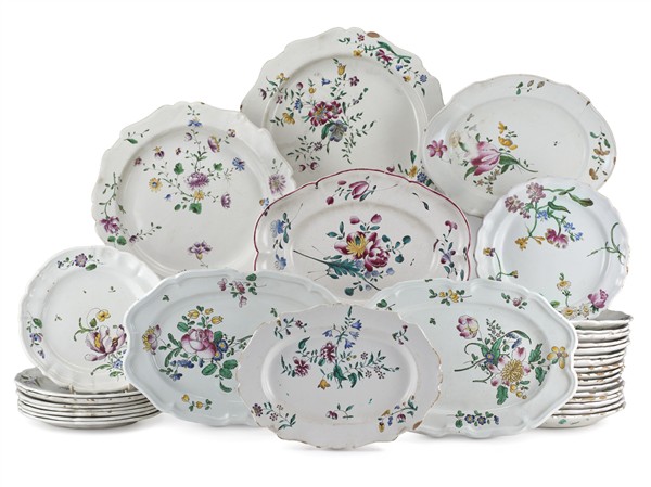 Manifatture di Lodi, Veuve Perrin ed altre, secolo XVIII-XIX. Lotto composto da sei vassoi, ventisei tra piatti piani e fondine in maiolica decorati a fiori in policromia, alcuni marcati al retro (difetti e mancanze)