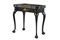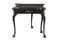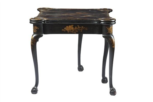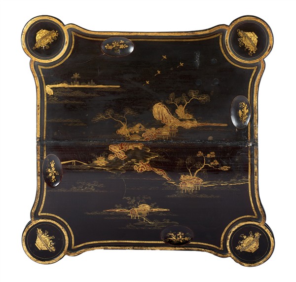 Tavolo da gioco in legno laccato nero a due piani apribili profilati in oro, uno con decori a chinoiserie con paesaggi, pagode dorate e lacca color rosso-bruno e ai lati contenitori di fiches centrati da vasi di fiori; l'altro con cinque vasi di fiori e nastri tra farfalle. Fascia decorata da tralcio fiorito, gambe mosse, piedi ad artiglio su sfera. Inghilterra, secolo XVIII (cm 80x73) (difetti)