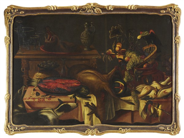 "Trionfo di selvaggina, crostacei e frutta con pappagallo e scoiattolo"