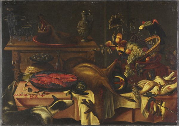 "Triumph of game, shellfish and fruit with parrot and squirrel"