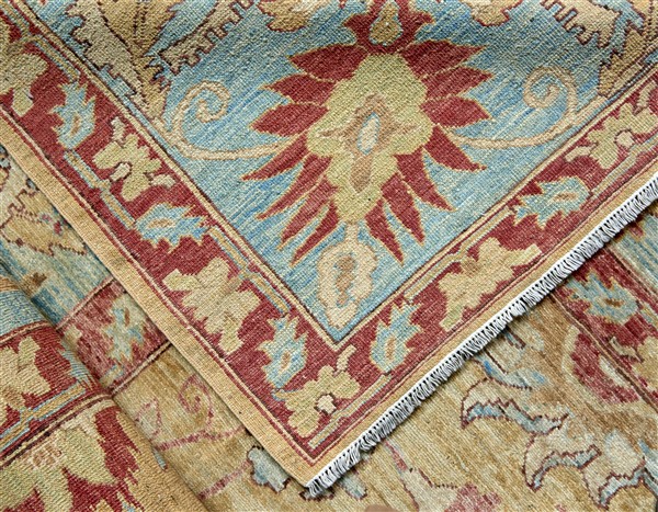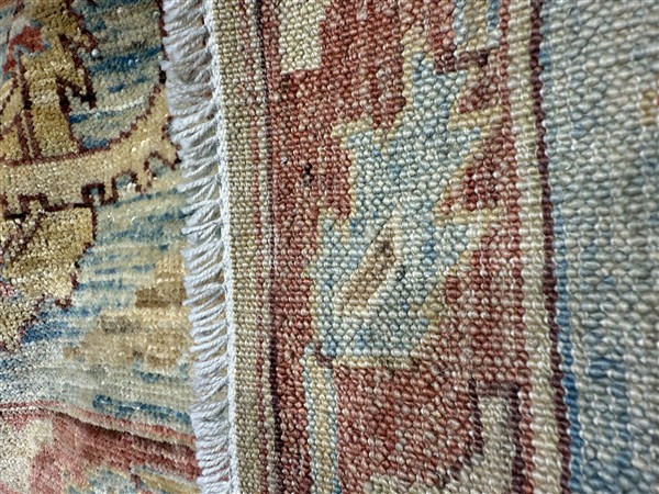 Tappeto Azeri, Caucaso. Secolo XX. Decoro floreale sparso in stile Serapi su fondo giallo, bordure a fondo azzurro (cm 367x270) (lievi difetti)