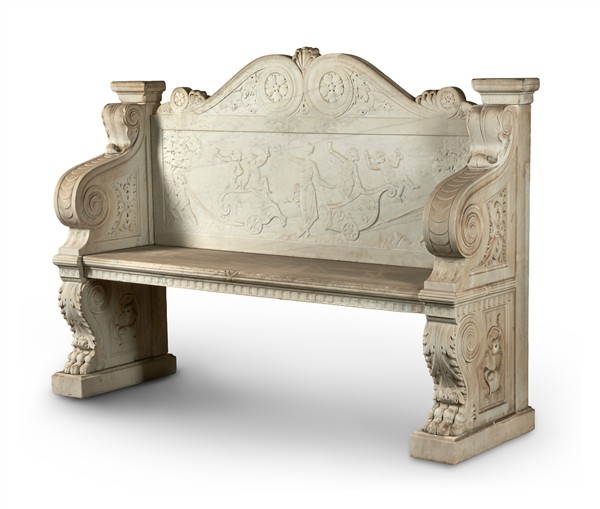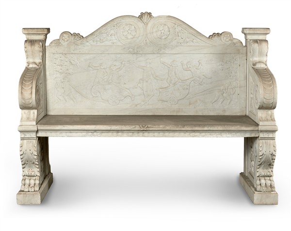 Panca in marmo bianco in stile pompeiano con schienale sagomato scolpito a bassorilievo con scena di baccanale. Montanti scolpiti a foglie d'acanto, riccioli e delfini, terminanti a piedi ferini (cm 167x120x96) (difetti)