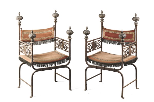 Coppia di antichi faldistori in ferro battuto con pinnacoli in bronzo decorati a rilievo a mascheroni. Fasce con stemmi medicei sbalzati. Seduta e schienale rivestiti in tessuto con fili di metallo argentato (difetti)